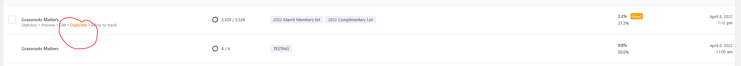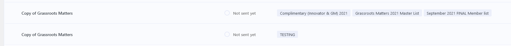 - The two duplicated emails will be displayed as Copy of Grassroots Matters.